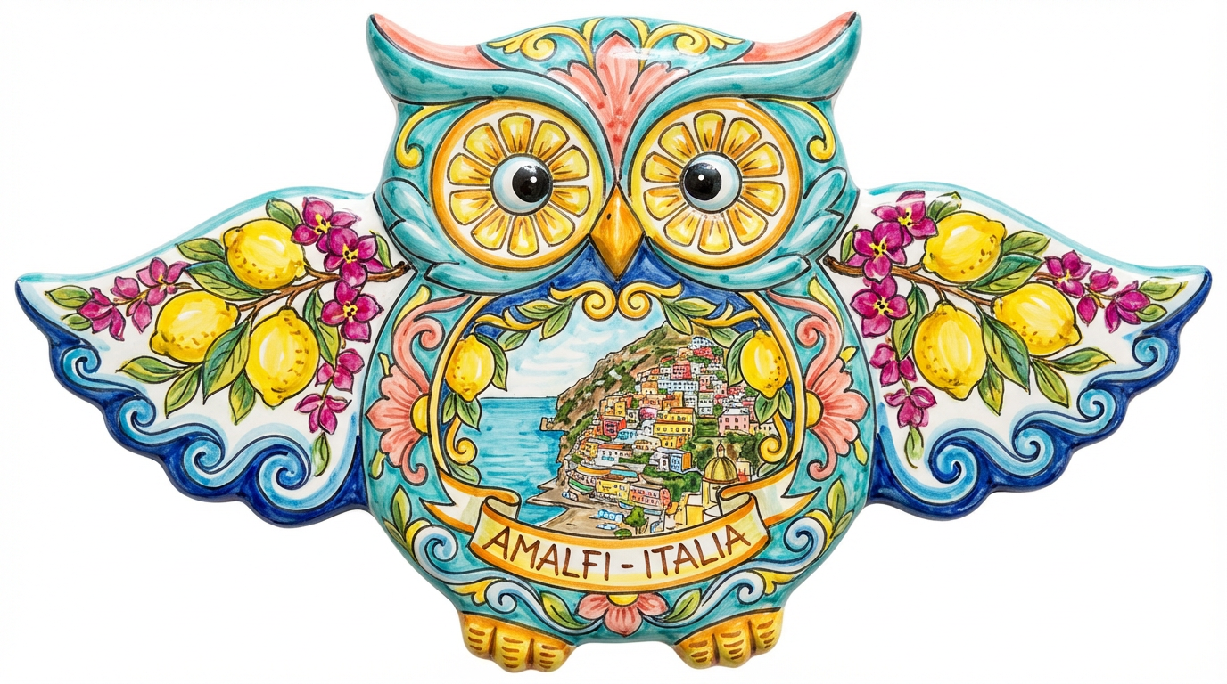 Handcrafted owl-shaped fridge magnet in Italian Majolica ceramic painting style featuring Amalfi’s Positano cliffs and lemons within the decorative pattern. Sun-drenched colours.