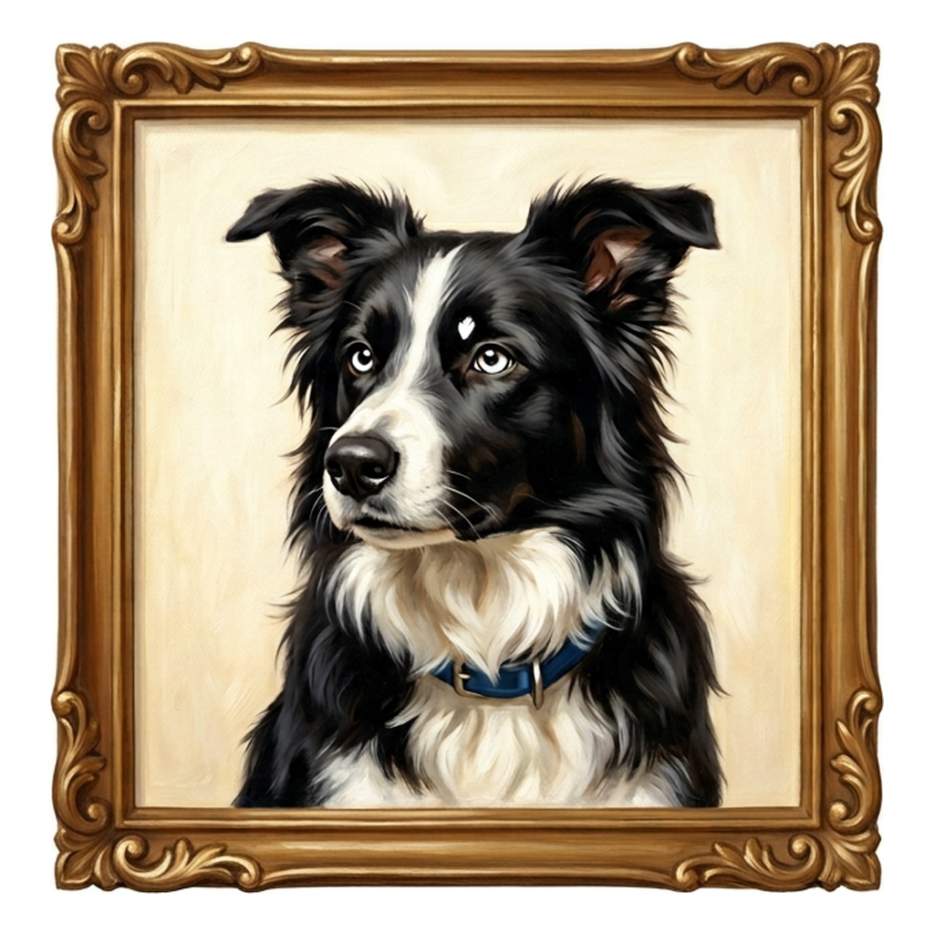 Striking wooden fridge magnet featuring a Border Collie portrait in oil-painting style with a golden baroque frame.
