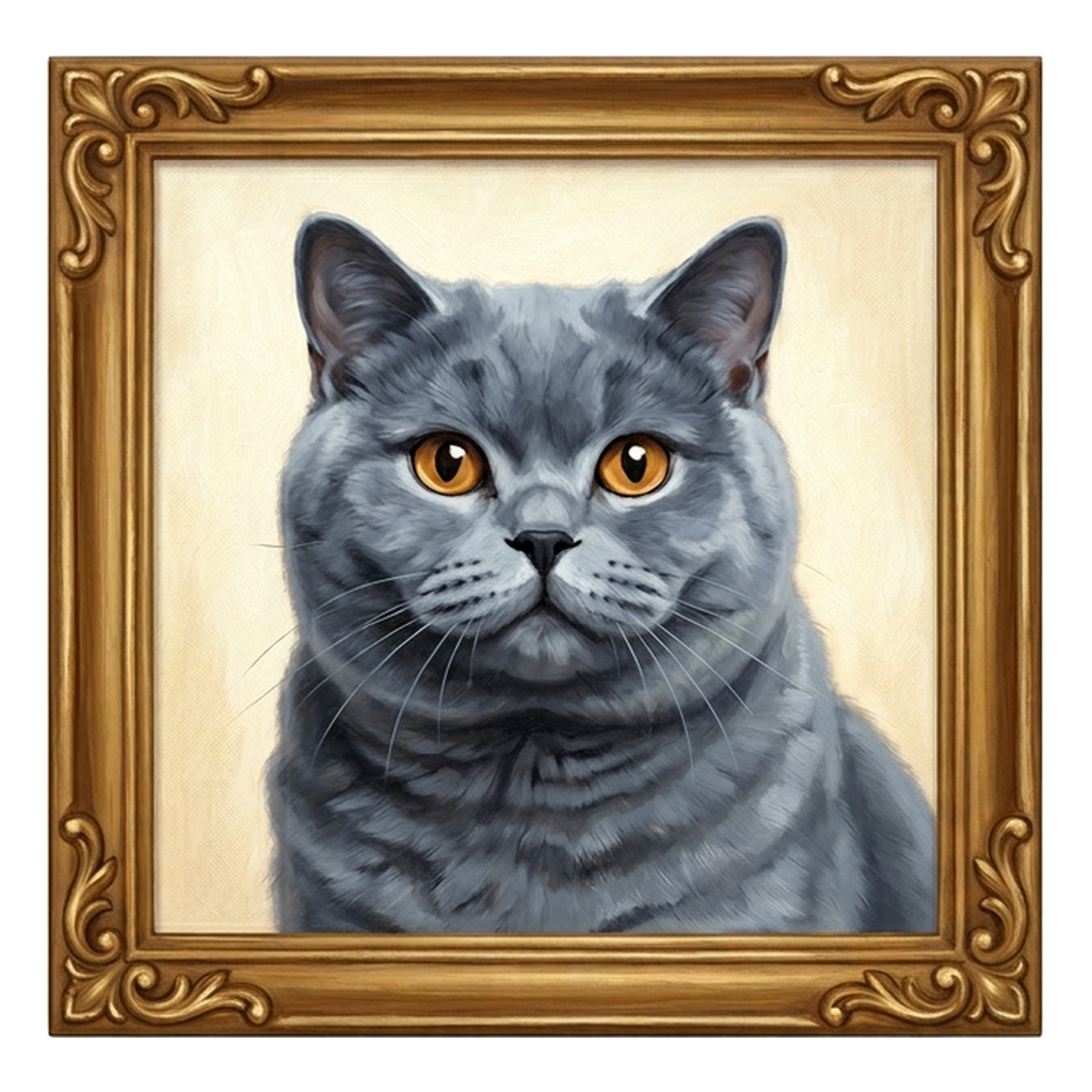 Regal wooden fridge magnet with a British Shorthair cat portrait in oil-painting style set in a golden baroque frame.