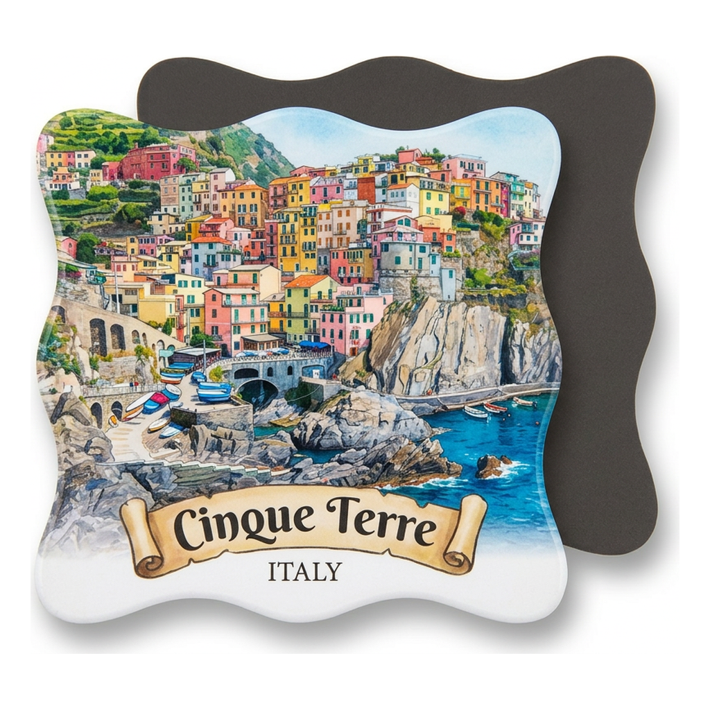 The rainbow villages of the Cinque Terre — five colorful fishing villages clinging to the dramatic cliffs of the Italian Riviera. This magnet captures Manarola (or Riomaggiore), with its bright yellow, pink, orange, and green houses stacked on steep rocky terrain above the deep blue Ligurian Sea.