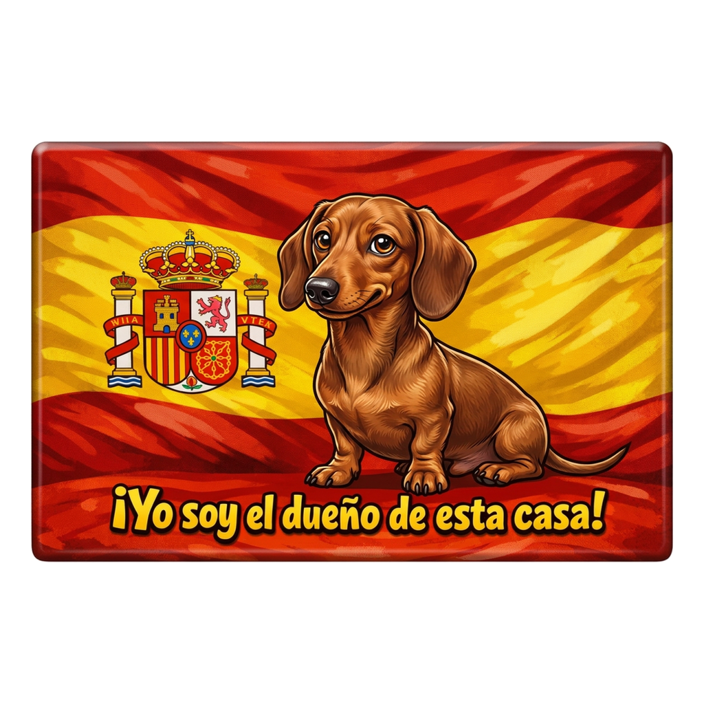 Funny Dachshund cartoon magnet with Spain flag. Text: “¡Yo soy el dueño de esta casa!” — perfect souvenir gift for Dachshund lovers.