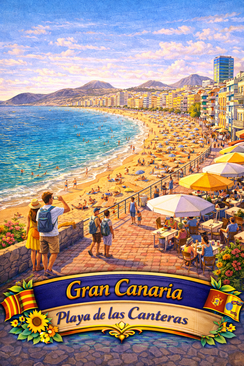 Playa de las Canteras — one of the world’s best city beaches. 3 km of golden sand in Las Palmas on plywood.
