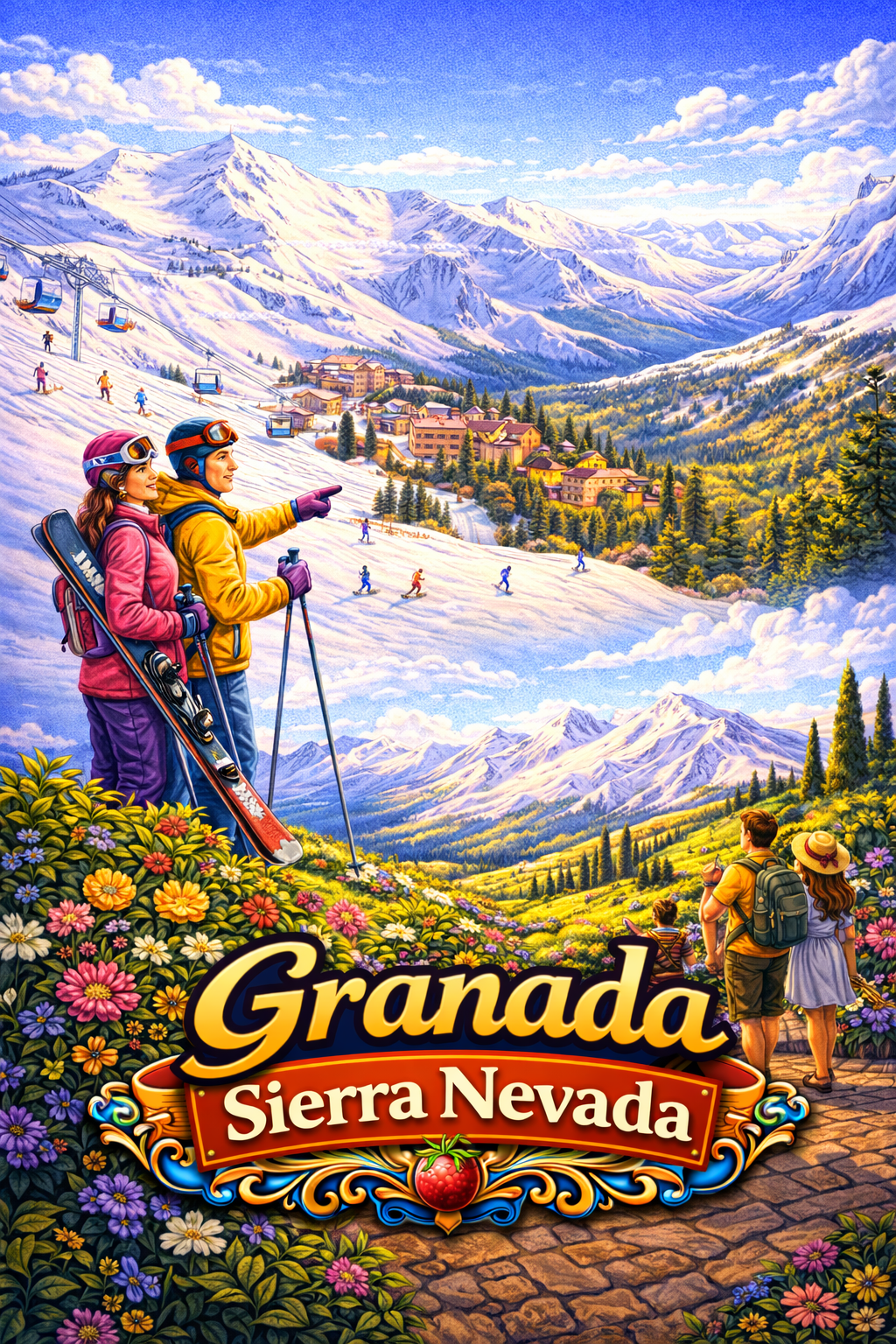 The Alhambra — Spain’s most visited monument. Moorish palace with Sierra Nevada backdrop on plywood.