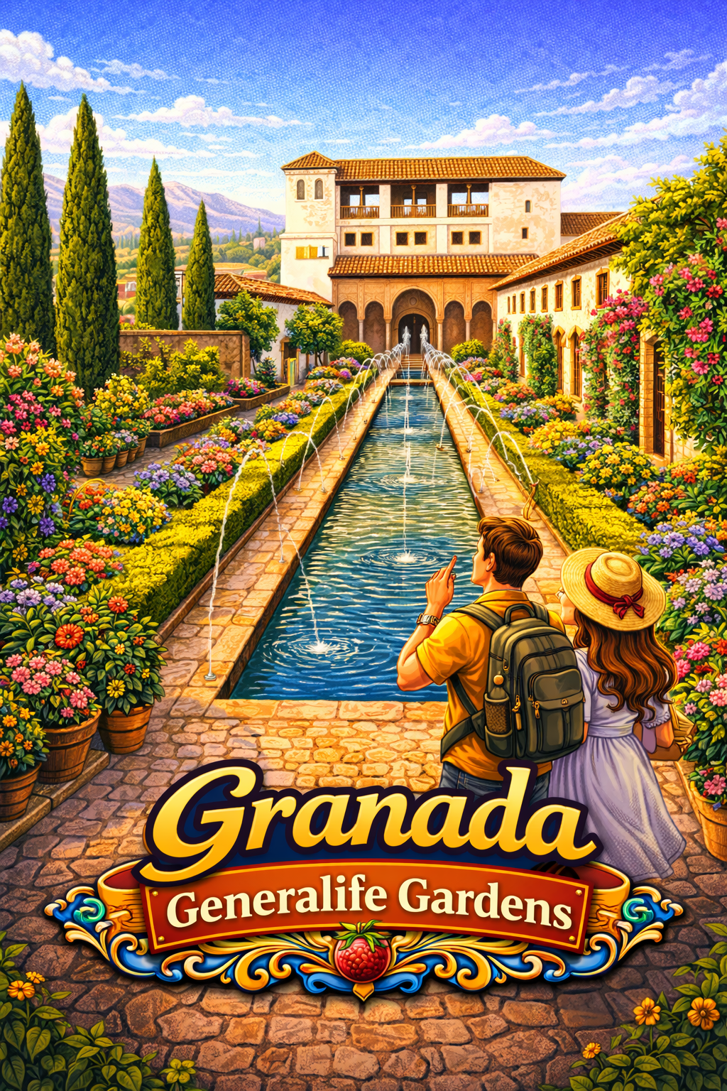 Generalife — the summer palace gardens of the Alhambra. Fountains, cypress lanes, and roses above Granada on plywood.
