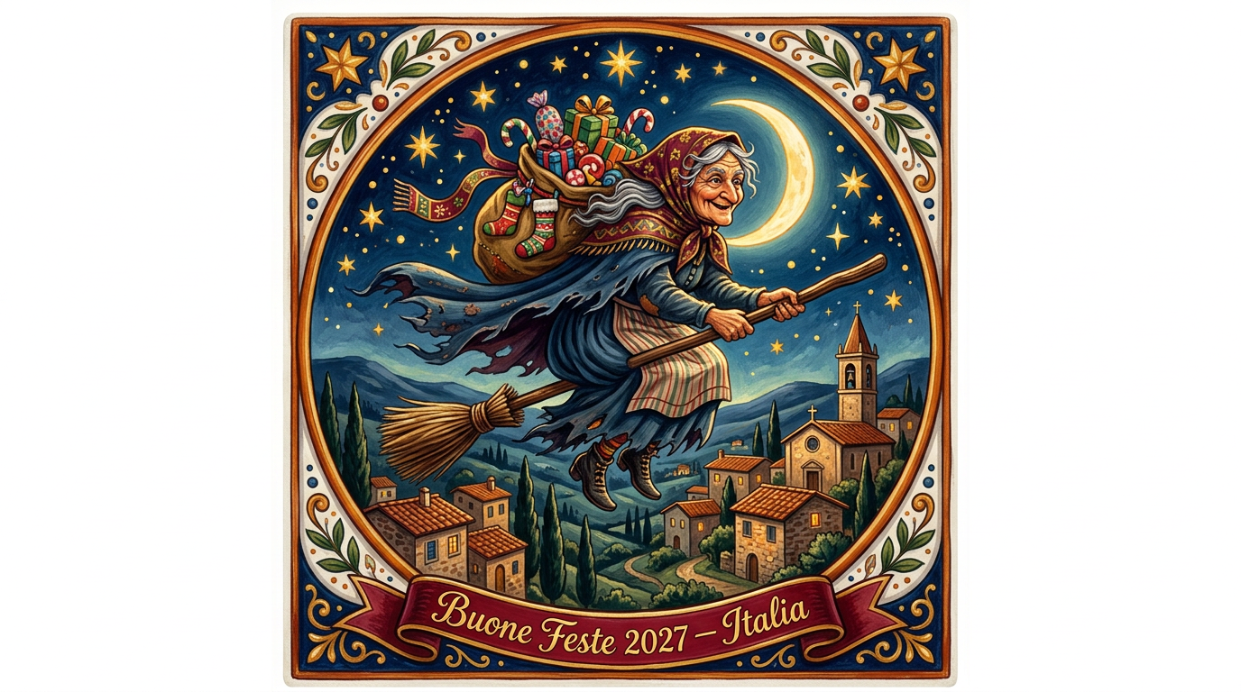 Handcrafted wooden fridge magnet featuring La Befana — Italy’s beloved Christmas witch — flying across a starlit Italian sky on Epiphany night.