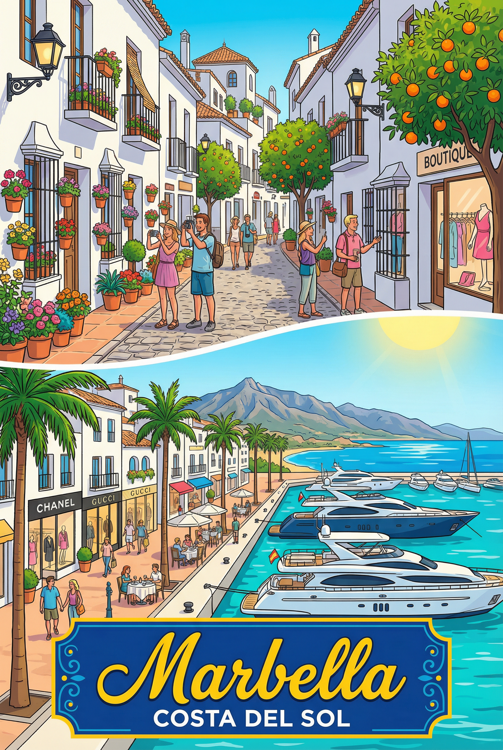 Marbella — luxury resort of Costa del Sol. Orange-tree plazas and yacht harbors on plywood.
