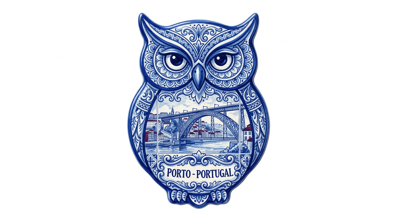 Celebrate Porto with this beautifully crafted azulejo owl magnet that transforms Portugal’s beloved tile art tradition into a stunning souvenir. The owl’s entire body is adorned with intricate blue-and-white hand-painted tile patterns — the same art form that covers Porto’s famous São Bento train station and countless church facades. On the owl’s belly, the azulejo composition features Porto’s most iconic landmarks: the magnificent Dom Luís I iron bridge arching over the Douro River and the colorful Ribeira waterfront houses. Subtle touches of port wine burgundy accent the composition. A decorative ribbon banner reads “PORTO – PORTUGAL.”
