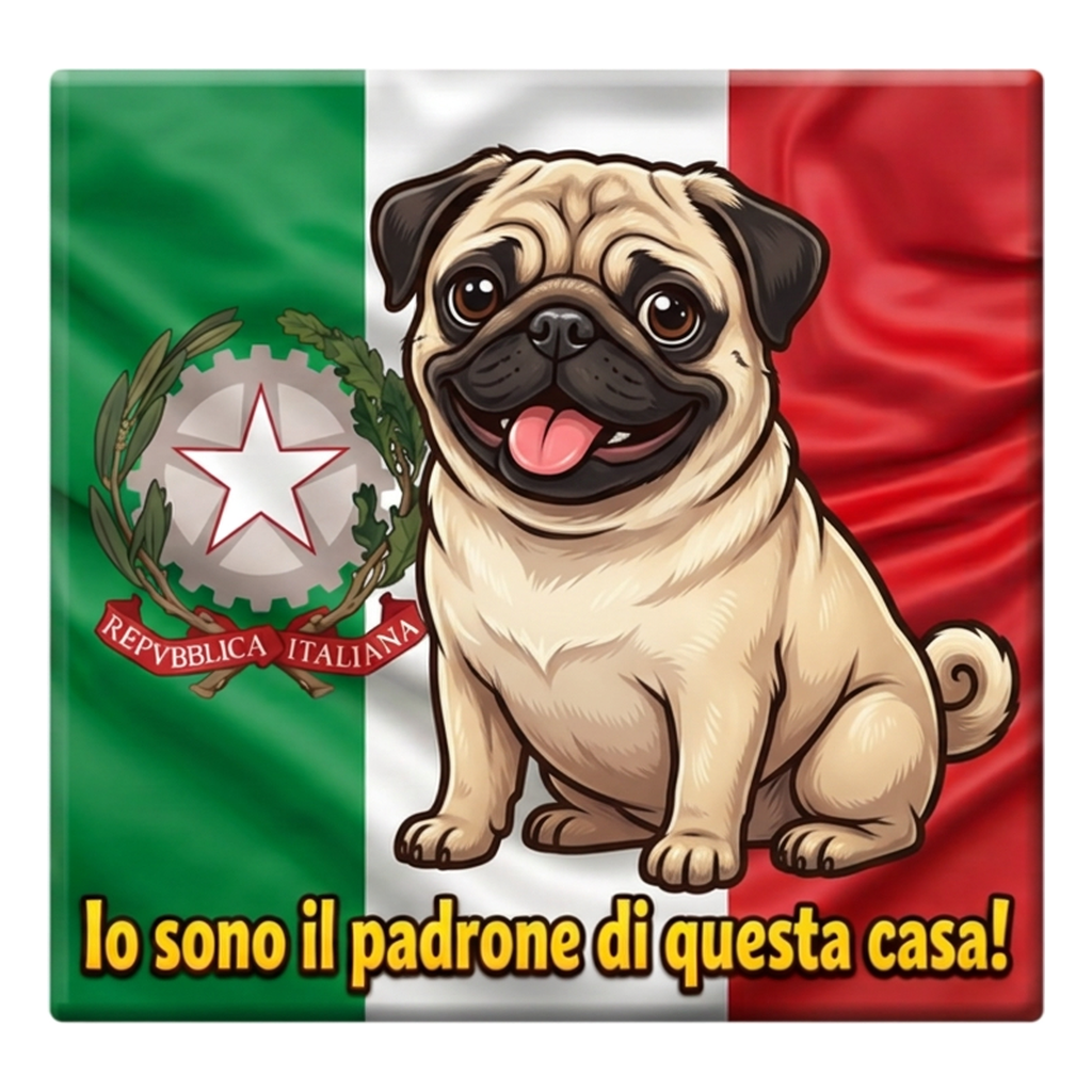 Funny Pug cartoon magnet with Italy flag. Text: “Io sono il padrone di questa casa!” — perfect souvenir gift for Pug lovers.
