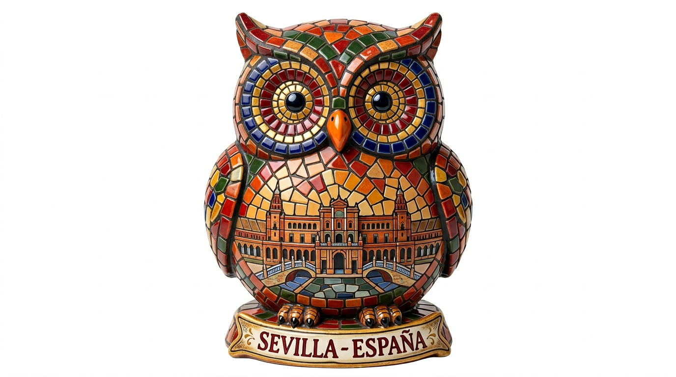 The Seville Flamenco Owl captures the passionate soul of Andalusia in mosaic form. This owl figurine is entirely covered in irregular ceramic tile fragments in a flamenco-warm palette — deep red, orange, gold, terracotta, and dark green — with dark grout lines creating the signature trencadís texture. On the belly, the mosaic tiles arrange themselves to reveal the unmistakable semicircular silhouette of the Plaza de España with its bridges and arches, as if the landmark were assembled from the same ceramic fragments. A decorative banner reads “SEVILLA – ESPAÑA” in bold dark red letters. Printed on birch plywood with a strong neodymium magnet, this handcrafted piece is perfect for anyone who has fallen in love with Seville’s flamenco spirit, Moorish architecture, and vibrant Andalusian culture.