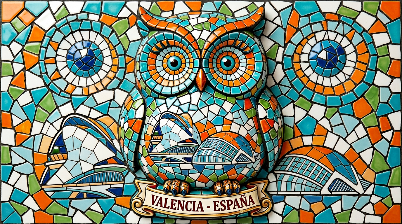 The Valencia Arts Owl merges Gaudí’s century-old mosaic tradition with Valencia’s futuristic architecture. This owl figurine is covered in irregular ceramic tile fragments in a fresh, modern palette — white, turquoise, bright orange, and fresh green — with dark grout lines that give it authentic trencadís texture. On the belly, the mosaic tiles form the unmistakable silhouette of the City of Arts and Sciences, with Calatrava’s sweeping Hemisfèric and Palau de les Arts emerging from the tile pattern. A decorative banner reads “VALENCIA – ESPAÑA” in bold dark red letters. Laser-cut from birch plywood and UV-printed, this handcrafted magnet is a striking souvenir that celebrates Valencia’s unique blend of tradition and innovation.