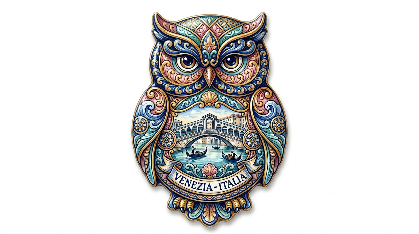Capture the magic of Venice through the lens of Italian ceramic artistry with this exquisite Majolica-style owl fridge magnet. Every surface of the owl is adorned with elaborate hand-painted patterns drawn from the Deruta pottery tradition — flowing arabesques, wave-like borders, and nautical rosettes in rich blue, shimmering gold, rose pink, and sea green. The owl’s belly showcases the iconic Rialto Bridge arching over a canal with graceful gondolas, all rendered within the decorative majolica pattern. A ribbon banner reads “VENEZIA – ITALIA” in elegant lettering.